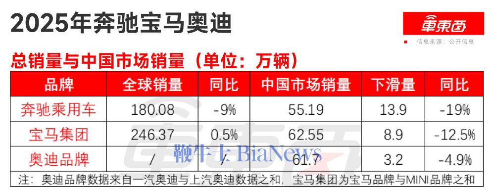 ▲2025年奔驰宝马奥迪总销量与中国市场销量