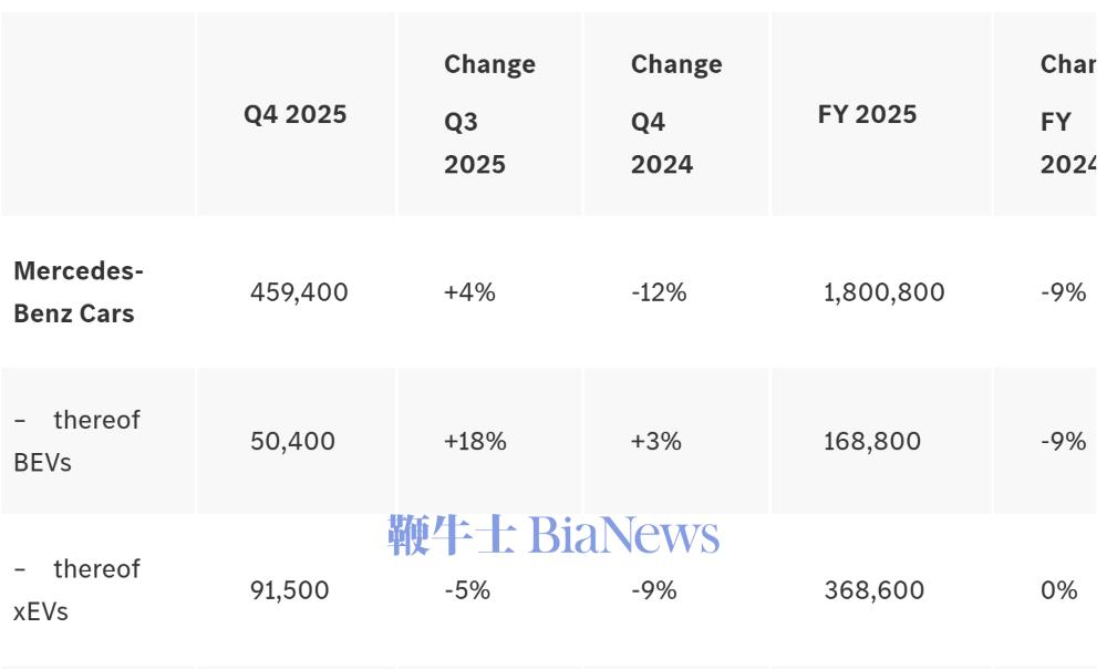 具体来看,2025年奔驰共售出216万辆乘用车和轻型商用车,其中乘用车(Mercedes-Benz Cars)全年销量为180万辆,同比下滑9%,全年纯电动乘用车(BEV)与插混(PHEV)车型销量合计36.86万辆,基本与去年持平。