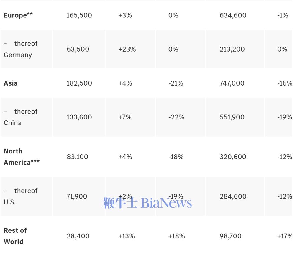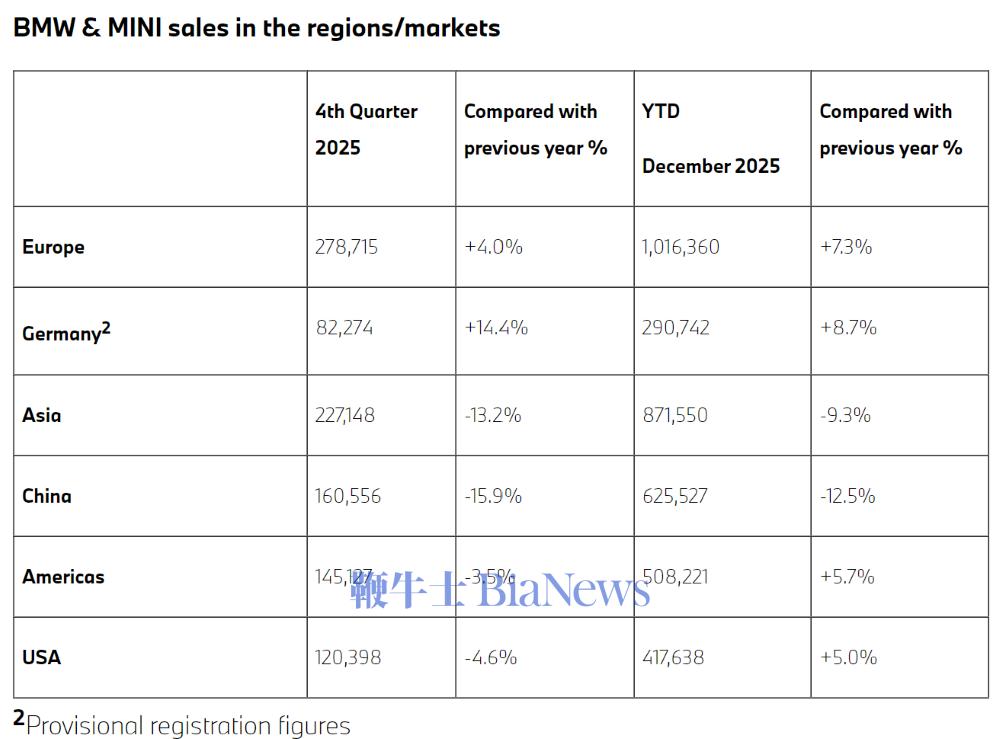但在2025年第四季度,宝马集团的销量为66.8万辆,同比下滑了4.1%。具体到不同地区来看,宝马集团给出了宝马和MINI这两个主要品牌在不同地区/市场的销量,分为欧洲、亚洲和美洲三大地区。