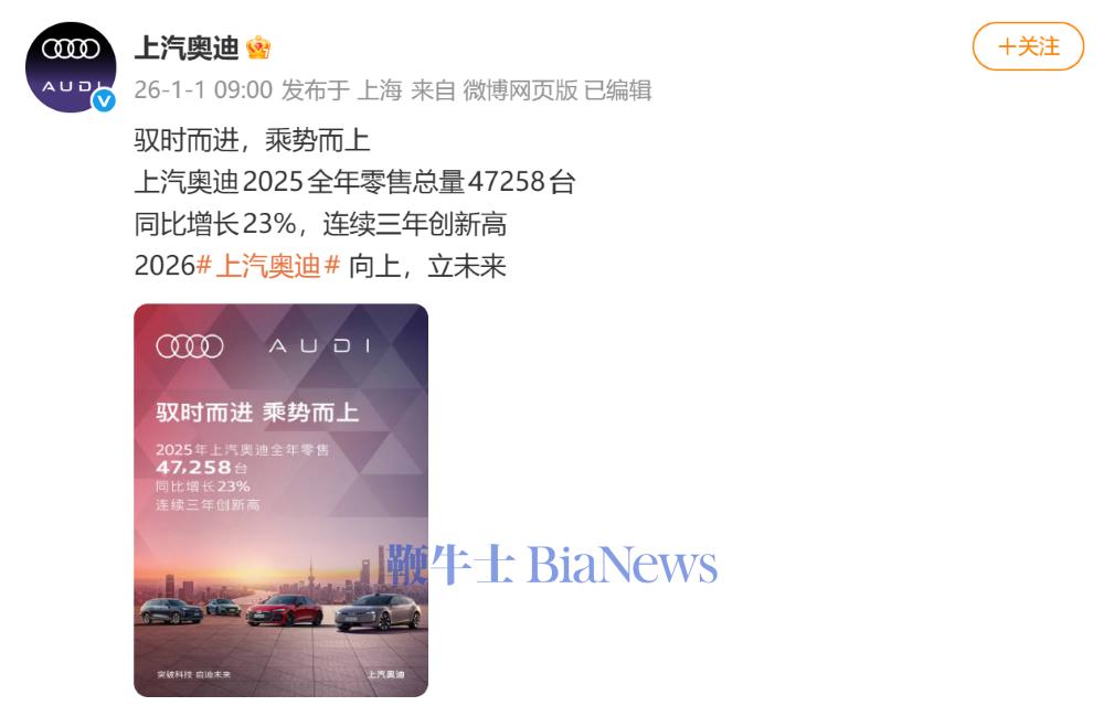 上汽奥迪2025全年零售总量47258辆,同比增长了23%。