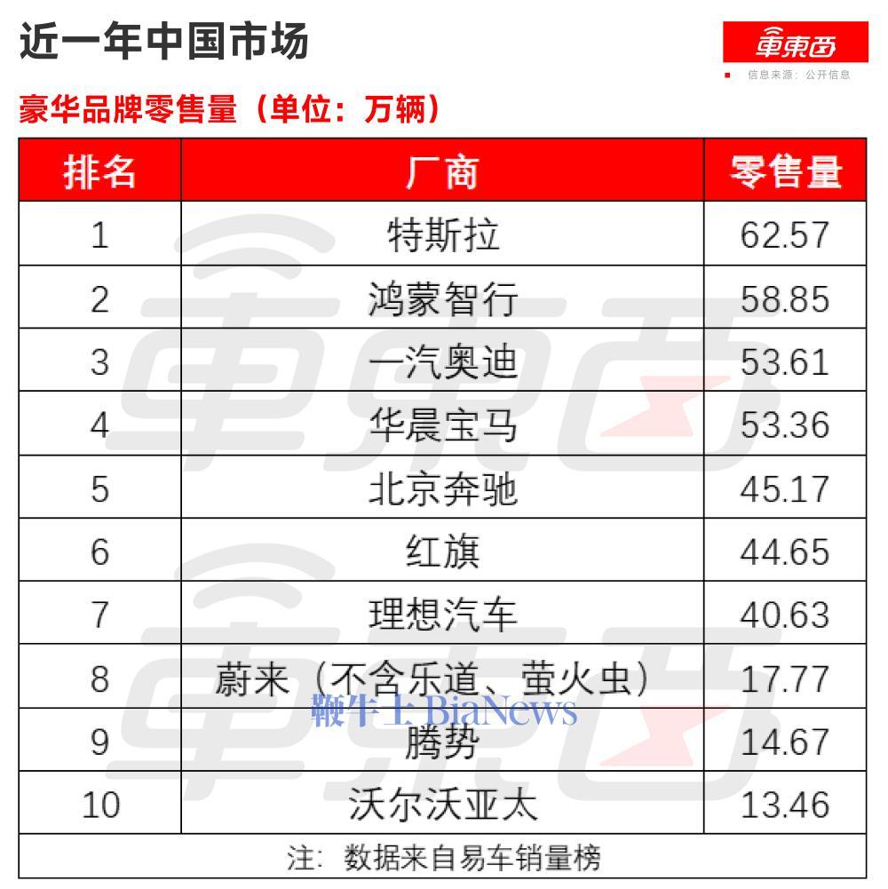 综合来看,奥迪品牌2025年在中国市场总销量约为61.7万辆,与2024年同期的64.9万辆相比下滑约3.2万辆,降幅约4.9%。从第三方平台公布的近一年中国市场豪华品牌零售量来看,特斯拉和鸿蒙智行均已经超过了BBA,在BBA身后,理想、蔚来和腾势等国内新能源品牌也在中国豪华汽车市场“攻城略地”。