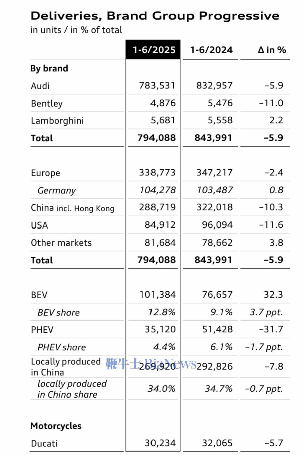 奥迪集团在中国上半年总交付量为28.87万辆,同比下降10.3%。