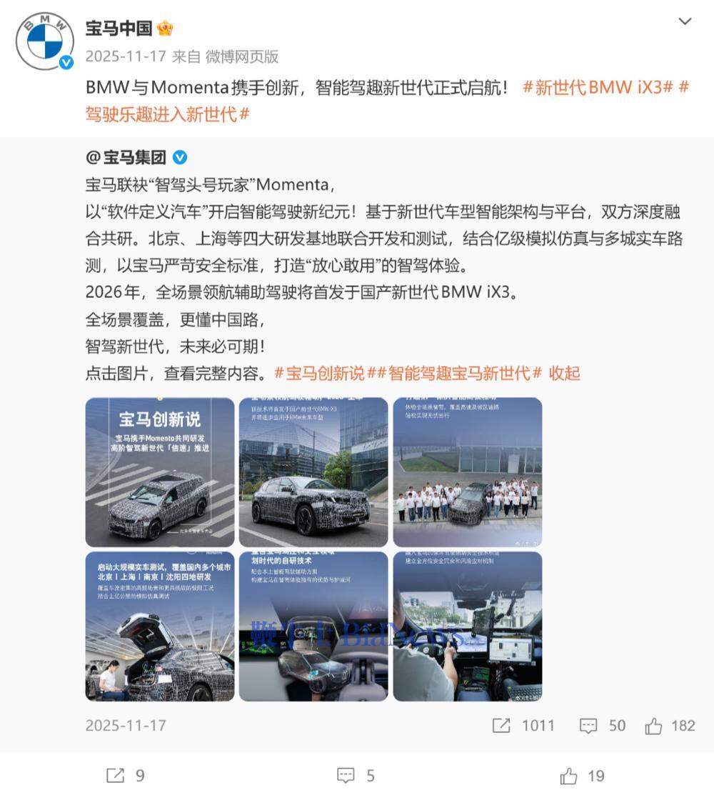 另外,从宝马自身的行动中也可以看出,宝马在抓紧时间赶上在中国市场电动化和智能化方面的差距。宝马集团日前发文提到,2026年将在中国市场投放20款新产品,其中国产长轴距版新世代BMW iX3将于上半年全球首发,并在下半年上市。