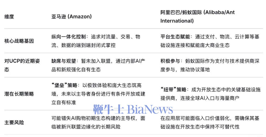 亚马逊与阿里系对谷歌UCP的不同应对,并非简单的对错之分,而是基于各自禀赋的路径选择。下表概括了二者的核心差异: