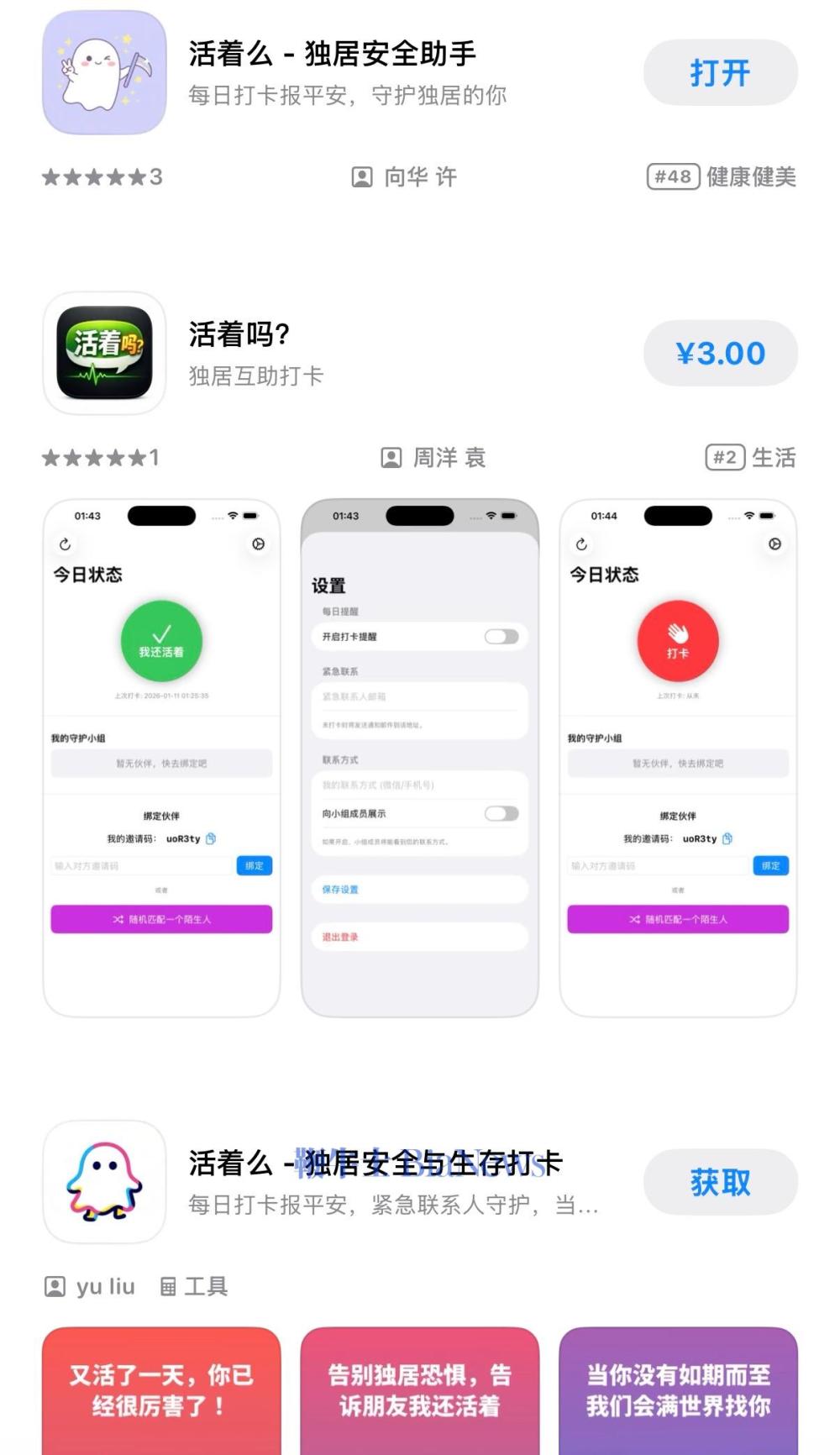 除了余香瓜开发的同款,还有一批新的“活着么”App已经出现,第一财经记者在AppStore搜索关键词,出现了十几款类似的打卡应用。有行业人士公开表示,这类App技术门槛太低,容易被复刻。