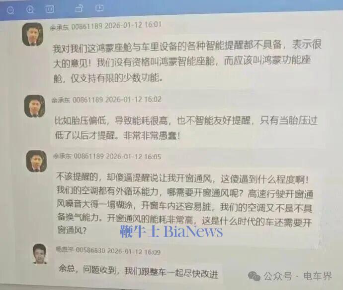 图中显示,余承东正批评鸿蒙座舱的功能开发,直言“非常愚蠢!”