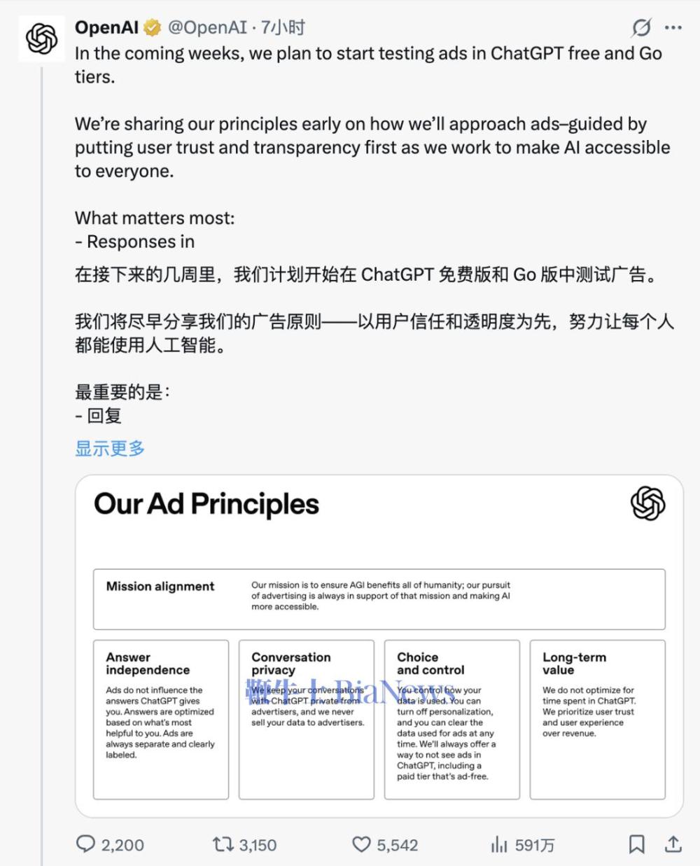 OpenAI 给出的理由很坦诚:引入广告是为了让更多人在免费或低门槛的情况下用上工具,毕竟昂贵的算力成本摆在那里,要实现「AI 普惠」的愿景,多元化的收入势在必行。