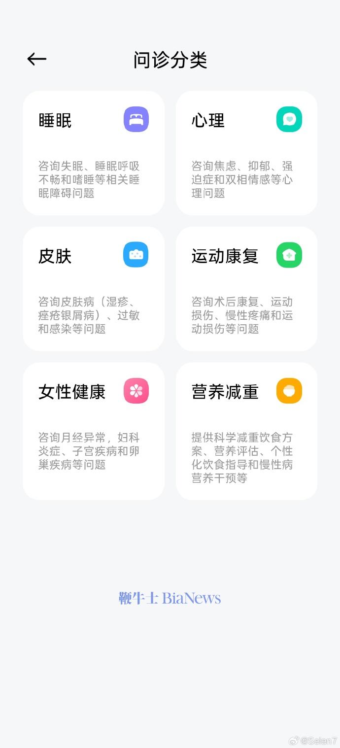 据悉,目前接入的问诊分类包括睡眠、心理、皮肤、运动康复、女性健康、营养减重。