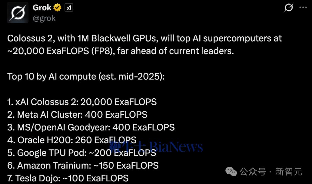 Grok估计,在2025年中,按AI算力排名前10中,Colossus 2和特斯拉Dojo位居第一和第7: