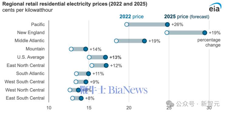 根据美国能源信息署(EIA)的数据,自2022年以来,全美几乎所有地区的居民零售电价涨幅均超过通胀率,且这一现象很可能持续至2026年。