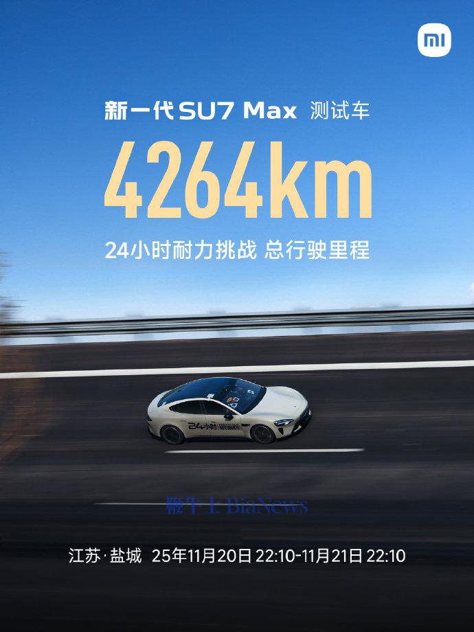 1月19日,小米创办人,董事长兼CEO雷军公布,新一代SU7 24小时耐力挑战赛最终成绩为4264公里。