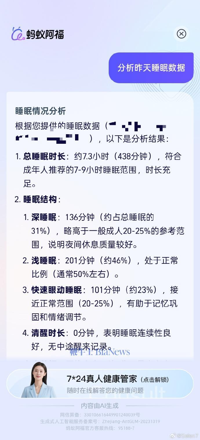 据介绍,接入蚂蚁阿福后,用户在睡眠、心率界面可以直接点击让阿福帮忙分析数据,利用AI分析进行初步健康建议。