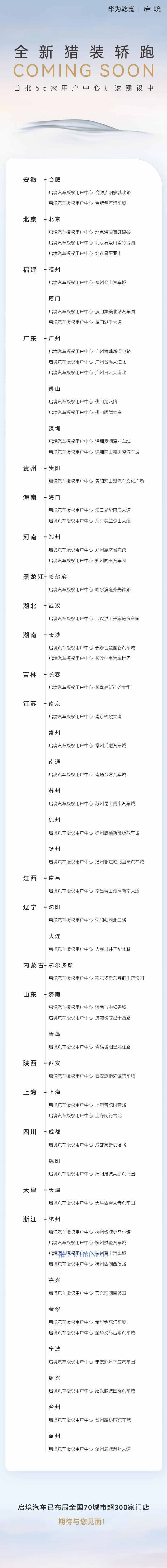 官方表示,启境汽车已布局全国70城市超300 家门店。