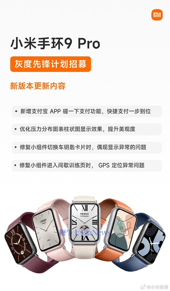 小米手环9 Pro先锋计划开启,新增支付宝「碰一下」快捷支付等功能