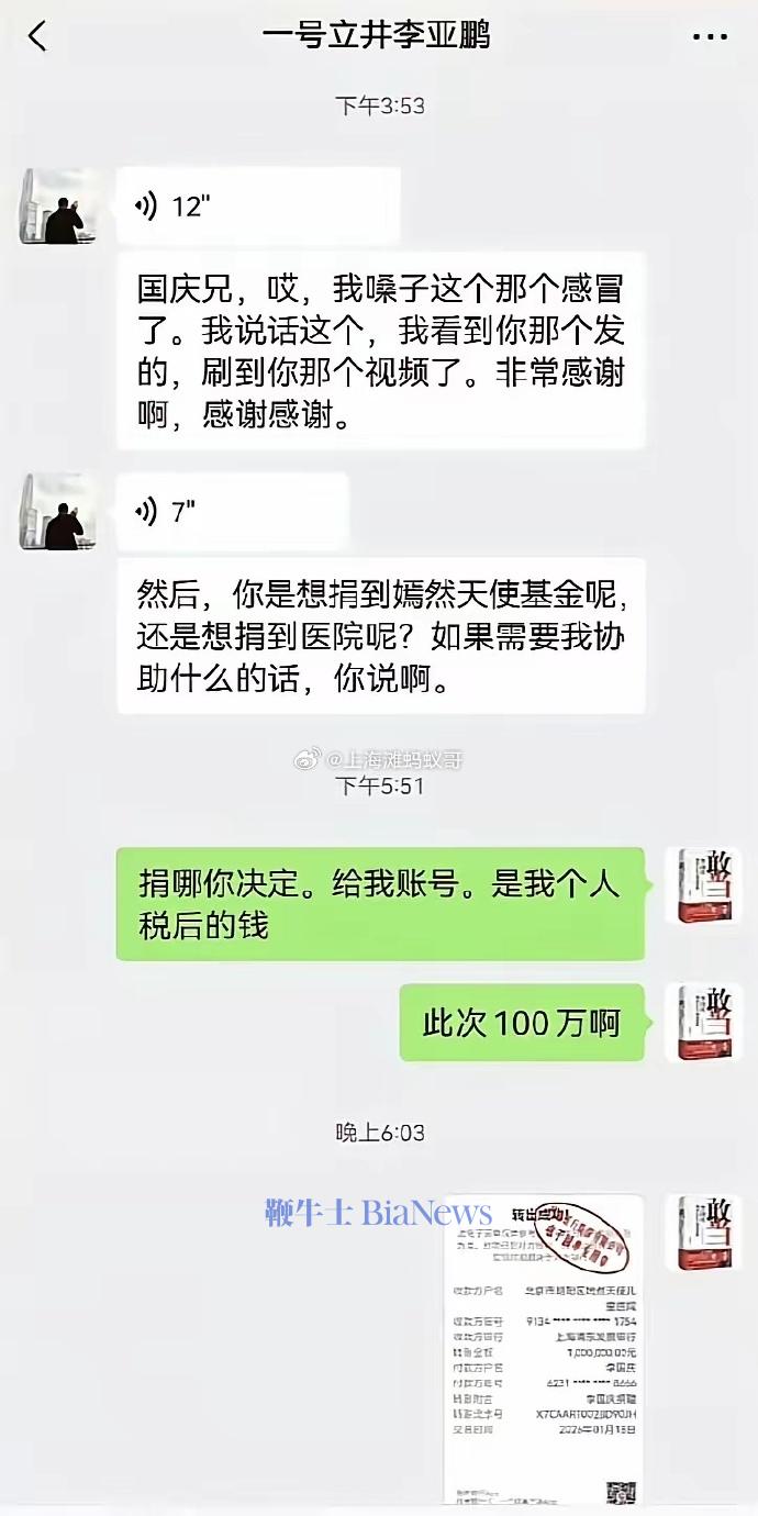1月18日,当当创始人李国庆对李亚鹏做公益表示佩服,他通过社交平台宣布,已向北京嫣然天使儿童医院捐款100万元,并晒出银行转账截图。