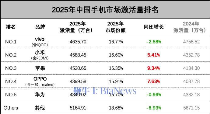 其中,vivo继续蝉联第一,激活量4635.7万台,同比略降2.58%;小米力压苹果升至第二,激活量4588.45万台,同比增长5.41%,小米17系列的爆火功不可没;苹果激活量4520.65万台,同比增长9.34%,排名第三;OPPO激活量4399.58万台,位居第四,华为激活量4340万台,位居第五。