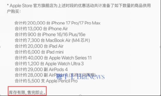 在此次“新春优惠”详情页中,Apple Store官方旗舰店宣称为本次优惠活动进行了商品供应数量的限制。其中,iPhone 17 Pro/17 Pro Max合计约20万台,iPhone Air合计约1.3万台,iPhone 16/16 Plus/16e合计约900台……并提示库存有限“售完即止”。