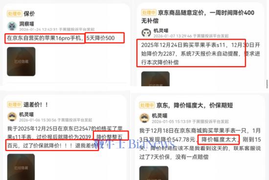 在黑猫投诉、小红书等平台上,有用户直言:“自己购买的苹果16 Pro手机,5天降价500元!”另有用户反馈,“降幅太大”,要求“退差价”。