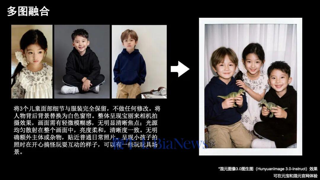 混元表示,混元图像3.0图生图支持多样化的图片编辑与多图融合能力,比如增、删、改、风格变换、老照片修复、人物与文字修改等图片编辑能力,以及把多张照片中的人物或元素提取出来合成合照与生成新图片等。