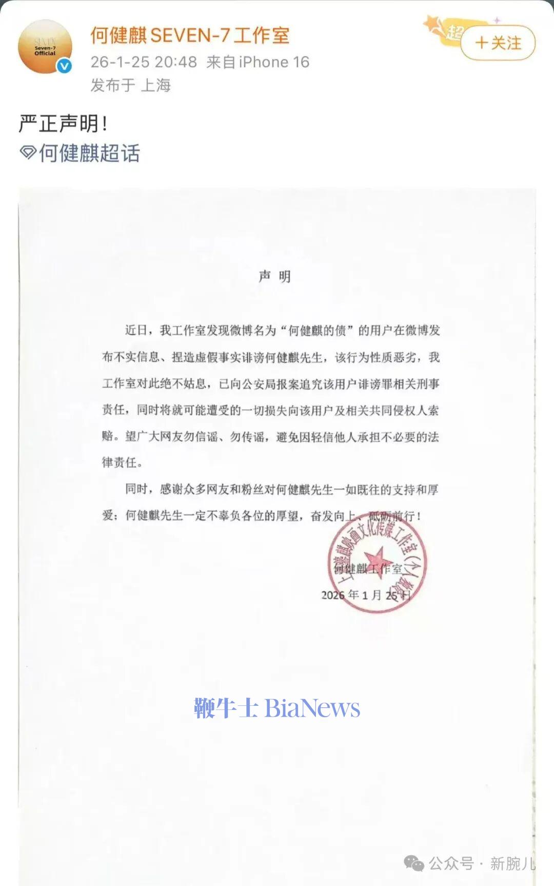 上述视频在19点30分发布后,“何健麒工作室”微博账号在昨晚20点48分发布一则声明,表示「微博名为“何健麒的债”的用户在微博发布不实信息、捏造事实诽谤何健麒先生,已向公安局报案追究该用户诽谤罪相关刑事责任。」