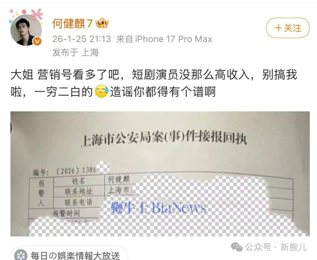 而后,何健麒个人微博也回应“短剧演员没那么高收入,别搞我啦。一穷二白的,造谣你得有个谱啊。”同时附上“上海市公安局案(事)件接报回执的照片,上面显示报警人为何健麒。