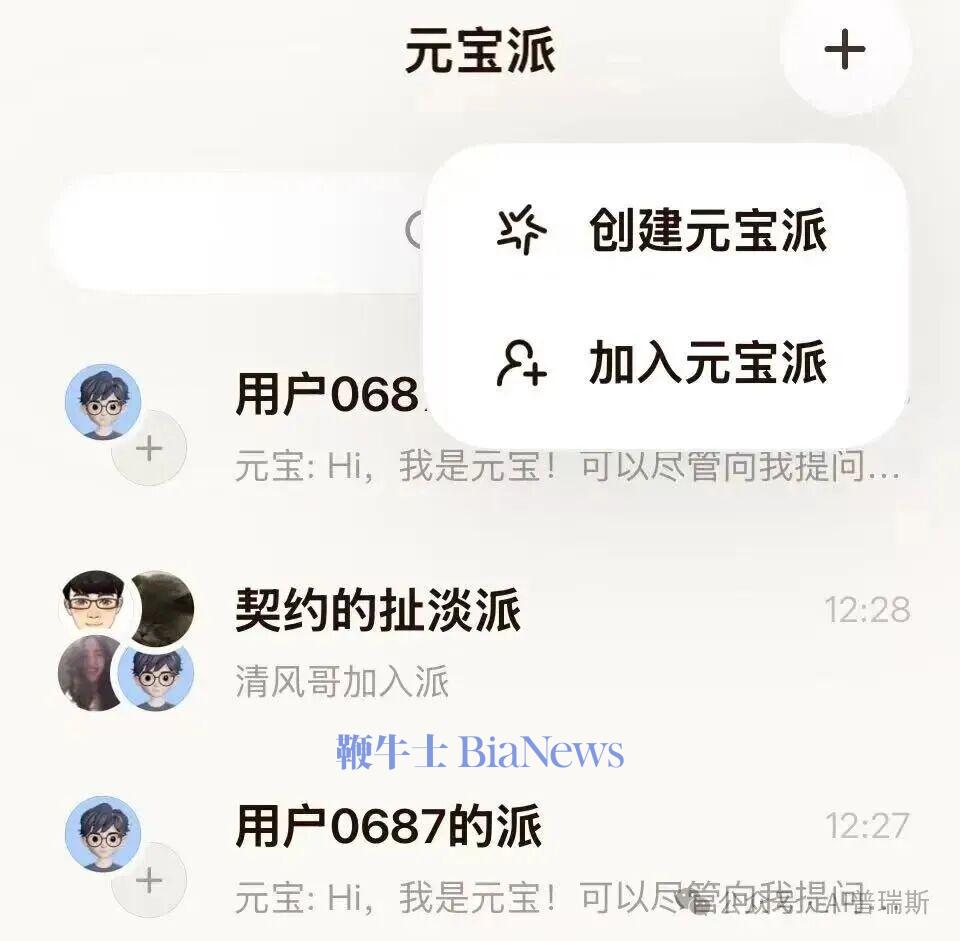在元宝派界面,点击右上角就可以拉上你的三五好友建群,同时,元宝AI也会作为一个“群友”常驻在里面。