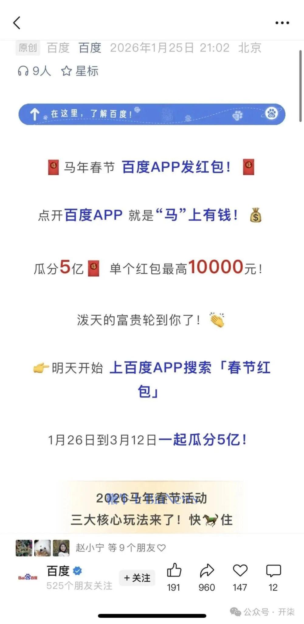 首先啊,说说补贴。有趣的是,在昨天下午腾讯元宝宣布了发放10亿现金红包之后,百度在几小时后也发了一个消息,大意就是,百度也要发红包了。不过呢,百度要发的红包是5亿,不是在单独的文心AI助手APP发的,而是在百度APP发的。根据百度的介绍,用户在百度APP搜索“春节红包”或者使用“文心助手”等,等有机会获得红包。你瞅瞅,发红包这是互联网公司们玩烂了的营销拉新手段,放在2026年依然不过时啊,所以,单从发红包这个事上来说,百度和腾讯算是撞车了。不过呢,不和豆包、千问逼,即便只和腾讯相比,百度的这波打法也落后了。人家腾讯元宝先宣布的发红包,而且金额更大,铆足了劲是要给自家的AI助手拉新来的。而百度的营销呢,公布的时间点晚于腾讯不说,金额也只有人家的一半,这无论是用户也好,舆论也好,那肯定更被腾讯所吸引啊。另外呢,百度在跟一小部分媒体的闭门会上,悄悄地披露了自己密谋的新功能——文心群聊,并称正在进行小规模内测。而这也与腾讯撞车了。有趣的是,昨天,腾讯元宝的群聊功能也已经上线,名为“元宝派”,昨天八姐也试过了。虽然腾讯方面称“派”的功能是内测,但据八姐的观察,我身边的几个朋友下载的元宝新版本都出现了这一功能,显然,这一群聊功能的内测范围可能远大于百度,对媒体和用户的影响力也远高于百度。当然,有的童鞋要说了,那会不会百度文心群聊就会比元宝要更好呢?额,就目前流出的截图信息而言,八姐觉得也没啥不同吧。比如,在元宝中,用户可以选择创建一个“派”,或者加入一个已有的“派”。用户可以在派内@元宝 或引用元宝的话,让元宝AI总结派内聊天、创建健身、阅读等兴趣打卡活动,由元宝AI担任“监督员”。不止文字聊天,用户还可以在派内进行“图片二创”,将一张普通的照片变成有趣的“梗图”或表情包。元宝派将开放上线“一起看”、“一起听”玩法,该玩法接⼊了腾讯会议的⾳视频底层能⼒,让⽤户可以邀请派内好友同步观看一部电影、一场比赛、听一首歌。而根据其他媒体报道,在百度内测文心助手2.0版本中,Agent已经可以自主判断什么时候该回复,无需用户主动提及,同时新增了“文心健康管家”等垂类智能体,在识别到相关问题时由群聊助手自动拉进群。未来,新增加的功能包括改变AI Agent的人设风格、支持图生图能力、支持在群聊内布置日程提醒等,还多了一批新的特色玩法类Agent。是不是差不多?要非说不同的话,那估计还是用“元宝派”的用户更多一些,毕竟,微信的月活超过14亿,要是到元宝里群聊一下,用户觉得也不费事,不用注册用户,一键就转过去了。而要是用百度的文心助手群聊,那估计还得费劲吧啦地注册登陆,说不定好多人就懒得做的。唉,反正啊,看起来,百度文心的这个群聊推出得又晚,社交基因又不行,这能不能做起来呢?八姐都替他们捏把汗。当然啦,再来说AI群聊这个事,八姐确实是看不太懂。而且,从去年11月开始,OpenAI、微软、谷歌等国外AI巨头们都推出了 AI 群聊能力,方向是协作、摘要、策划辅助,但好像现在也没有流行起来。所以啊,这个功能到底是不是伪命题,咱也不好说。但不管咋地,八姐觉得吧,百度做2C端的AI助手,真可谓是起了个大早,赶了个晚集。就拿春节营销和群聊这个事来说,你资金不如其他巨头雄厚可以理解,完全可以早于腾讯发布啊,这样才有先发优势啊,总好过于现在处处节奏落后于人。当然,也有可能,百度志不在此,2B端的AI才是百度的核心方向。嗯,当我没说。(转载自开柒)