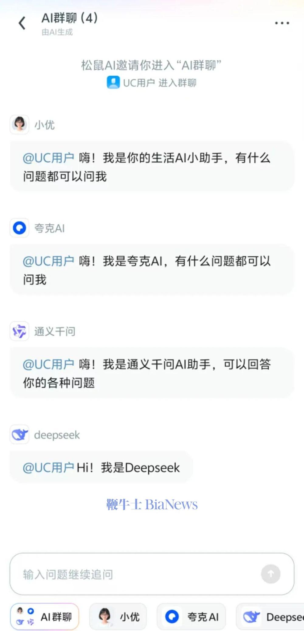 与单一AI助手交互模式不同,UC推出的AI群聊为多Agent架构,群聊默认成员包含四大智能体:UC浏览器原生智能AI助手“小优”、阿里系同门夸克AI,通义千问,以及外部合作的Deepseek,形成了跨体系智能交互矩阵。