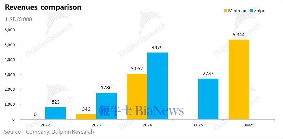 两个大模型公司Minimax和智谱,都是“短小精悍”型——人手少、产品迭代快,收入增长快。人数到2025年下半年没超一千人,收入零起步,两三年年化收入都在快速迈向一亿美金。
