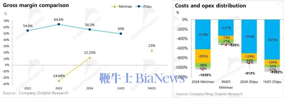 但到了支出层,再高增的收入都被凶猛的投入比得相形见绌:即使收入增长过程中,Model to B公司智谱持续保持在50%的高毛利,还是Model to C公司Minimax毛利率翻正。