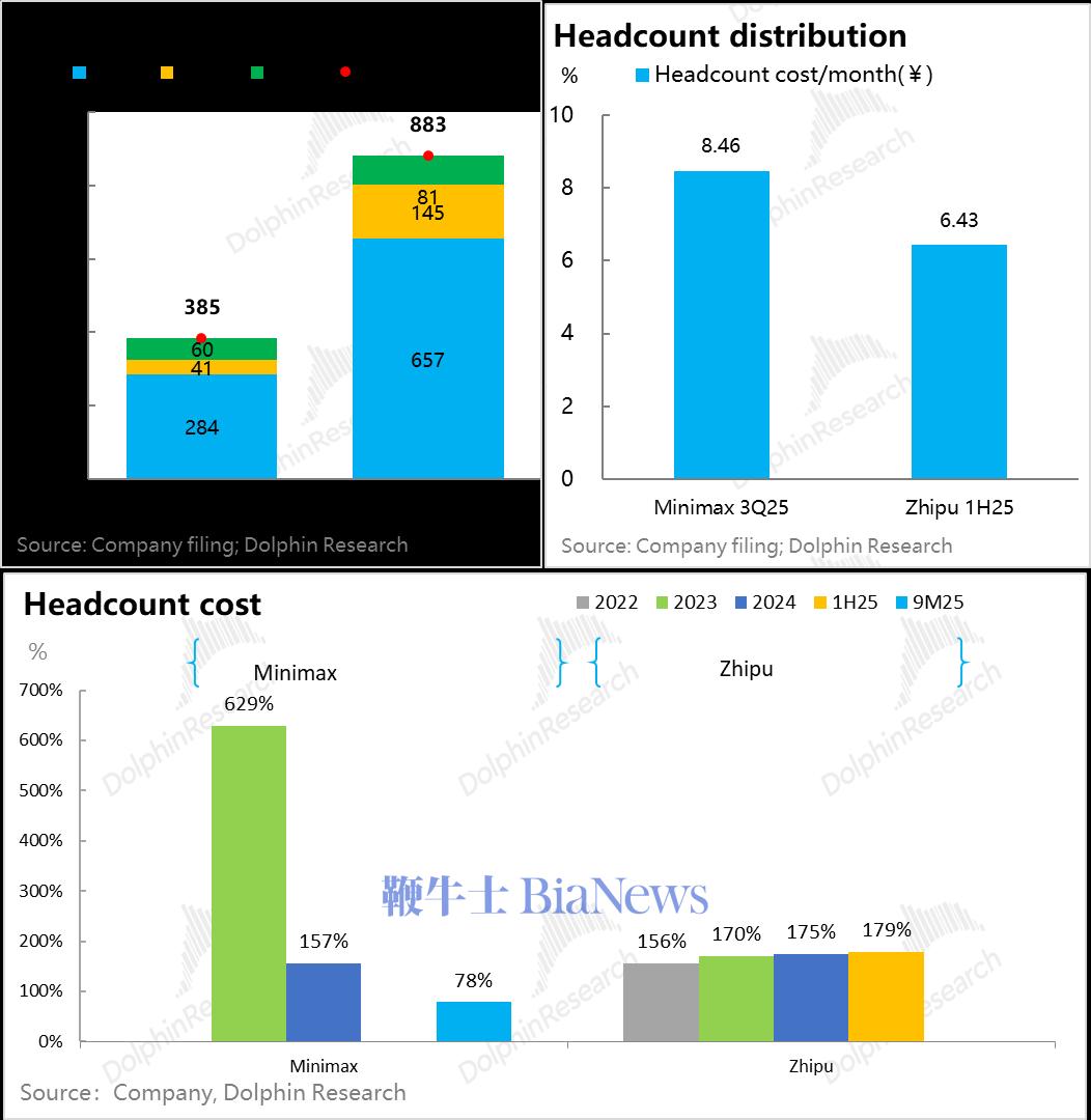 两个公司员工整体都没超1000人,尤其是Minimax都不足400人;两家公司研发人员都接近75%,单人头月成本6.5-8.5万元人民币(不含期权激励),其中Minimax研发人员单人月成本是16万。