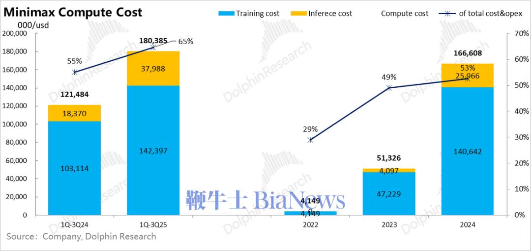 这Minimax和智谱两家公司来看,为了研发模型,单单训练算力投入全部占到了总支出的50%以上,是开支的绝对大头,也是妥妥的“吸金黑洞”,贡献了两家公司5-10倍亏损率中的一半以上的支出。