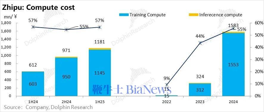 但智谱的情况就是一个非常明显的收入高增,但对训练成本的回收能力,因为训练成本增长斜率更高,反而越来越弱。