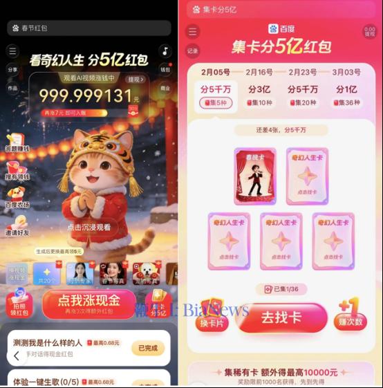 面对如此直白的“撒钱”挑战,百度文心助手在1月25日晚果断接招,宣布启动“5亿现金红包”活动,并打出“最高可得1万元”的亮点。同时,上线近100种春节主题 AI 玩法,包括边看视频边领钱、集卡赢万元现⾦、AI 春联创作、AI 写真、AI 相机、AI 测运势、AI 夸夸等。百度APP还将以“奇幻人生”为主题,上线近200款AIGC创作玩法,用户一键即可制作专属马年奇幻大片。
