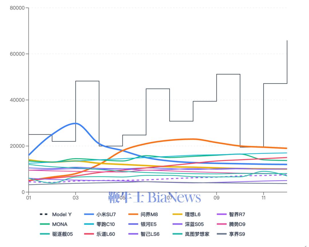 据中汽数研统计,2025年销量最高的新势力车型TOP5中,小米独占两席。其中,夺得榜首的小米SU7交出了一份典型的答卷:从2024年4月首月的7000辆,到2025年3月触达近3万辆的顶峰,随后在年末稳步回归到1.2万辆左右的平台期。