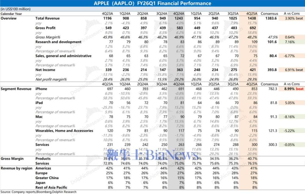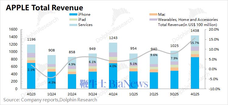 1.1 收入端:2026财年第一季度(即4Q25)苹果公司实现营收1438亿美元,同比增长15.7%,好于市场预期(1383亿美元)。公司本季度收入端的提升,主要受益于iPhone、iPad和软件服务业务增长的带动,而Mac和可穿戴等其他硬件业务表现有所下滑。