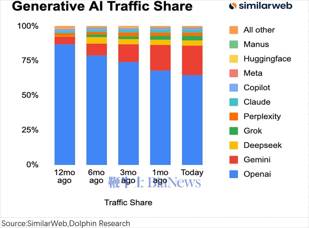 至于为什么选择Gemini呢?一方面是苹果和谷歌本身就有每年超200亿美元的搜索合作;另一方面Gemini的市场份额呈现明显上升的态势,至今已经突破两成。