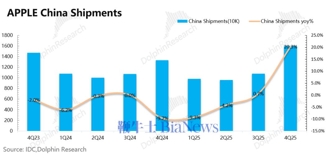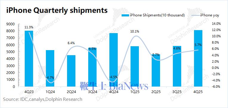 1)iPhone 出货量:根据IDC的数据,2025年第四季度全球智能手机市场同比增长1.4%。苹果本季度全球出货量同比增长5.7%左右,公司的出货量表现好于整体市场。