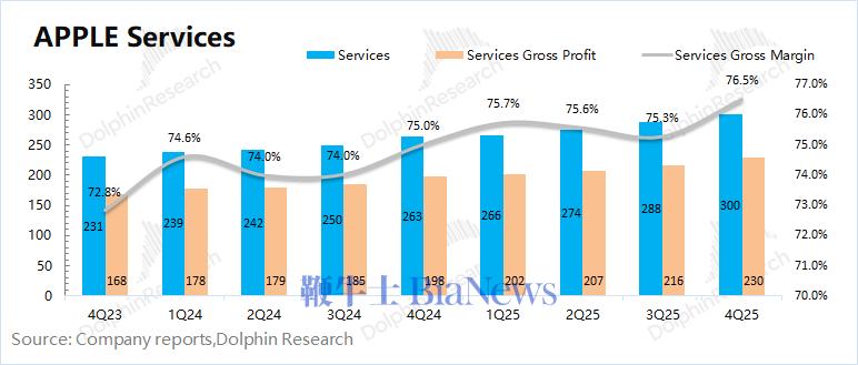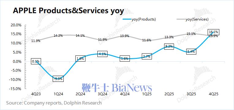 2026财年第一季度(即4Q25)软件服务收入300亿美元,同比增长13%,符合市场一致预期(300亿美元)。即使在美国App Store允许外部链接的情况下,苹果软件服务收入依然维持着两位数的增长,体现了苹果软件生态的壁垒。