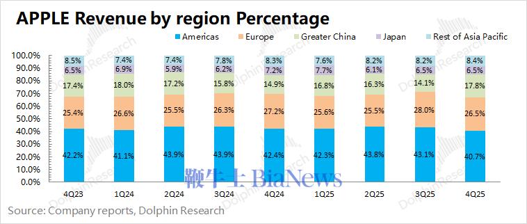2)iPhone 出货均价:结合iPhone 业务收入和出货量测算,本季度 iPhone 出货均价为1049美元左右,同比增长16.7%。受iPhone17新机和美元贬值的影响,美国以外的地区收入和产品价格都享受汇率优势的利好(在从外币换成美元计入的时候)。