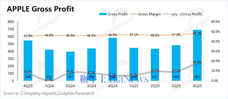 在本季度数据之外,公司管理层还给出了下季度指引:公司下季度营收同比增长13-16%,对应1078-1106亿美元;预计下季度的毛利率为48-49%,其中iPhone依然是增长的主要推动力。虽然存储涨价对下季度的毛利率影响会更大,但公司指引依然有望稳中有升。