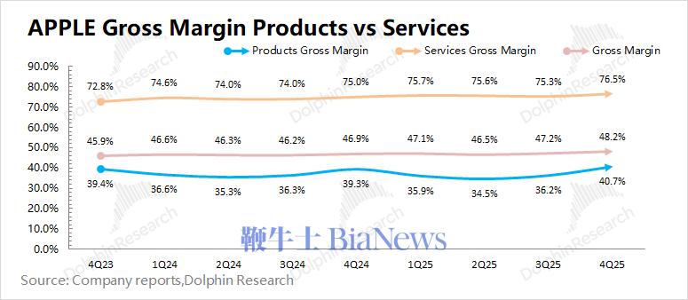 ①收入端增长:主要来源于iPhone17系列的带动。其中本季度iPhone增长23%,虽然iPhone17系列创新不多,但“加量不加价”的策略取得不错的效果。尤其是iPhone17 256G也能享受国补的政策,中国大陆地区销量实现大幅提升;