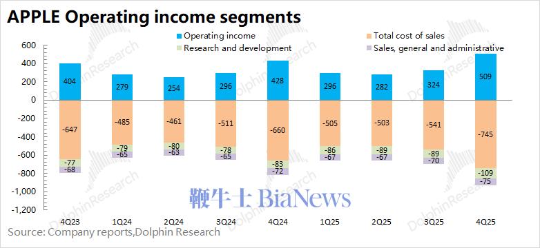 1.3 经营利润:2026财年第一季度(即4Q25)苹果公司经营利润509亿美元,同比增长18.7%。苹果公司本季度经营利润的增长,是受收入增长和毛利率提升的共同带动。