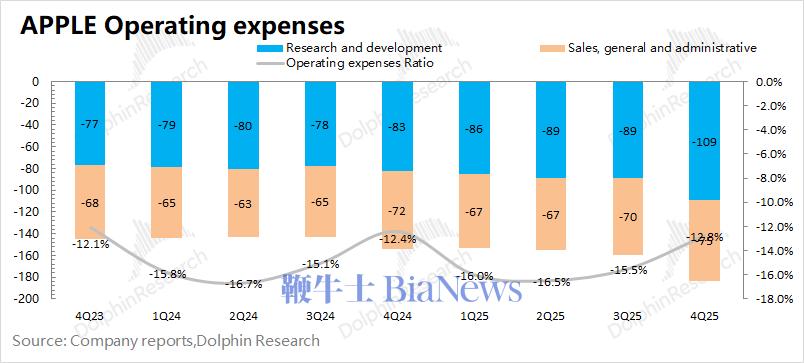 本季度苹果公司的经营费用率为12.8%,同比提升0.4pct。公司销售和行政费用保持稳定,公司对研发投入近两个季度都有所增加。
