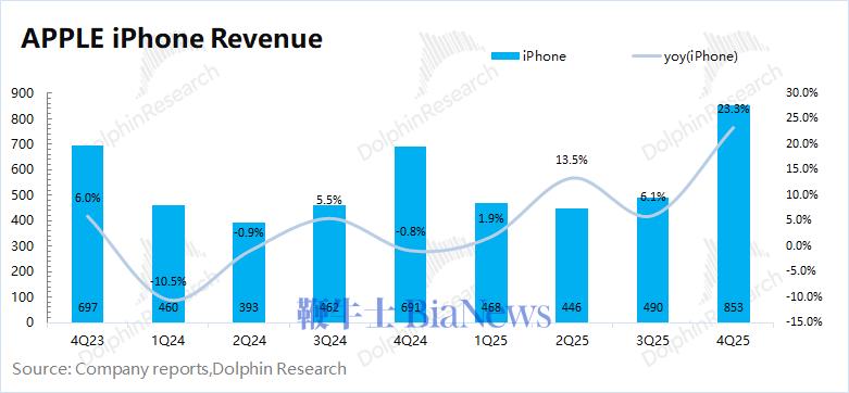 2026财年第一季度(即4Q25) iPhone 业务收入853亿美元,同比增长23%,好于市场预期(782亿美元)。公司iPhone业务本季度的增长,主要得益于iPhone17系列新品以及美元贬值的带动。