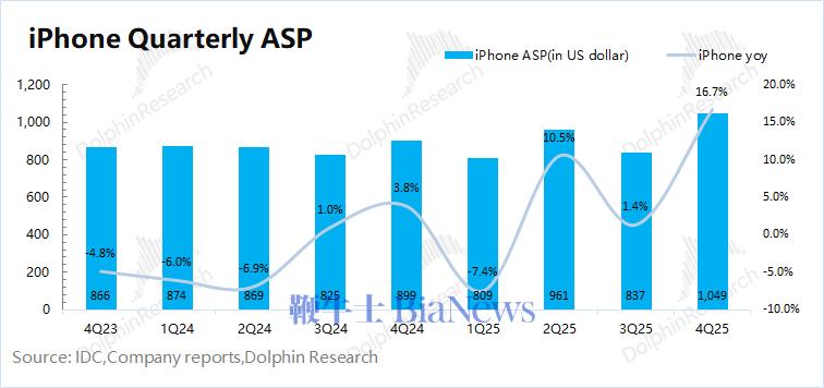 2、iPhone:本季度公司iPhone业务实现营收853亿美元,同比增长23.3%,远好于市场预期(782亿美元)。本季度手机业务的增长,受iPhone17系列新品和美元贬值的影响。对于本季度,海豚君估算iPhone整体出货量同比增长5.7%,出货均价同比上涨16.7%。