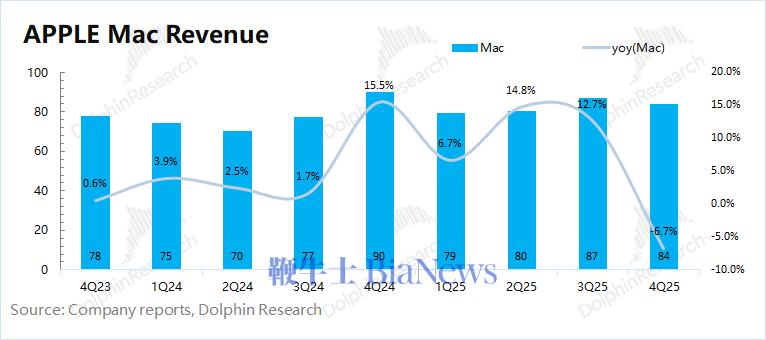 2026财年第一季度(即4Q25)Mac 业务收入84亿美元,同比下滑6.7%,不及市场预期(91亿美元),主要是受受去年M4机型热销的高基数影响。
