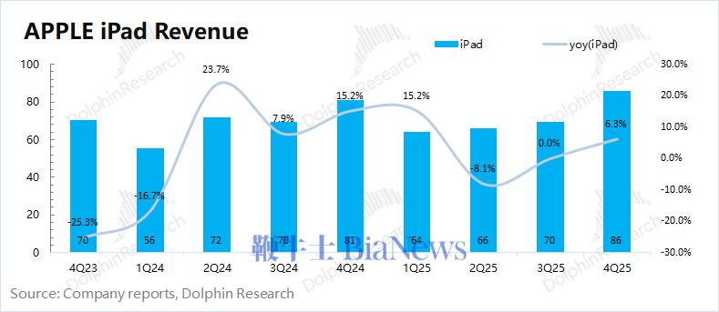 2026财年第一季度(即4Q25)iPad 业务收入86亿美元,同比增长6.3%,略好于市场一致预期(82亿美元),主要得益于M5 Pro、A16机型增长的带动。