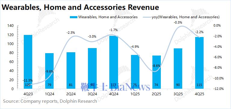 2026财年第一季度(即4Q25)可穿戴等其他硬件业务收入115亿美元,同比下滑2.2%,不及市场预期(121亿美元),本季度依然低迷。