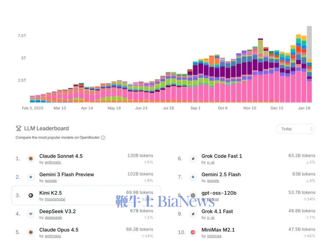 继上一代模型K2发布会后,K2.5继续引发了海外热潮。在Openrouter上,K2.5的排名已经来到第三位,仅次于Claude Sonnet 4.5和Gemini 3 Flash。